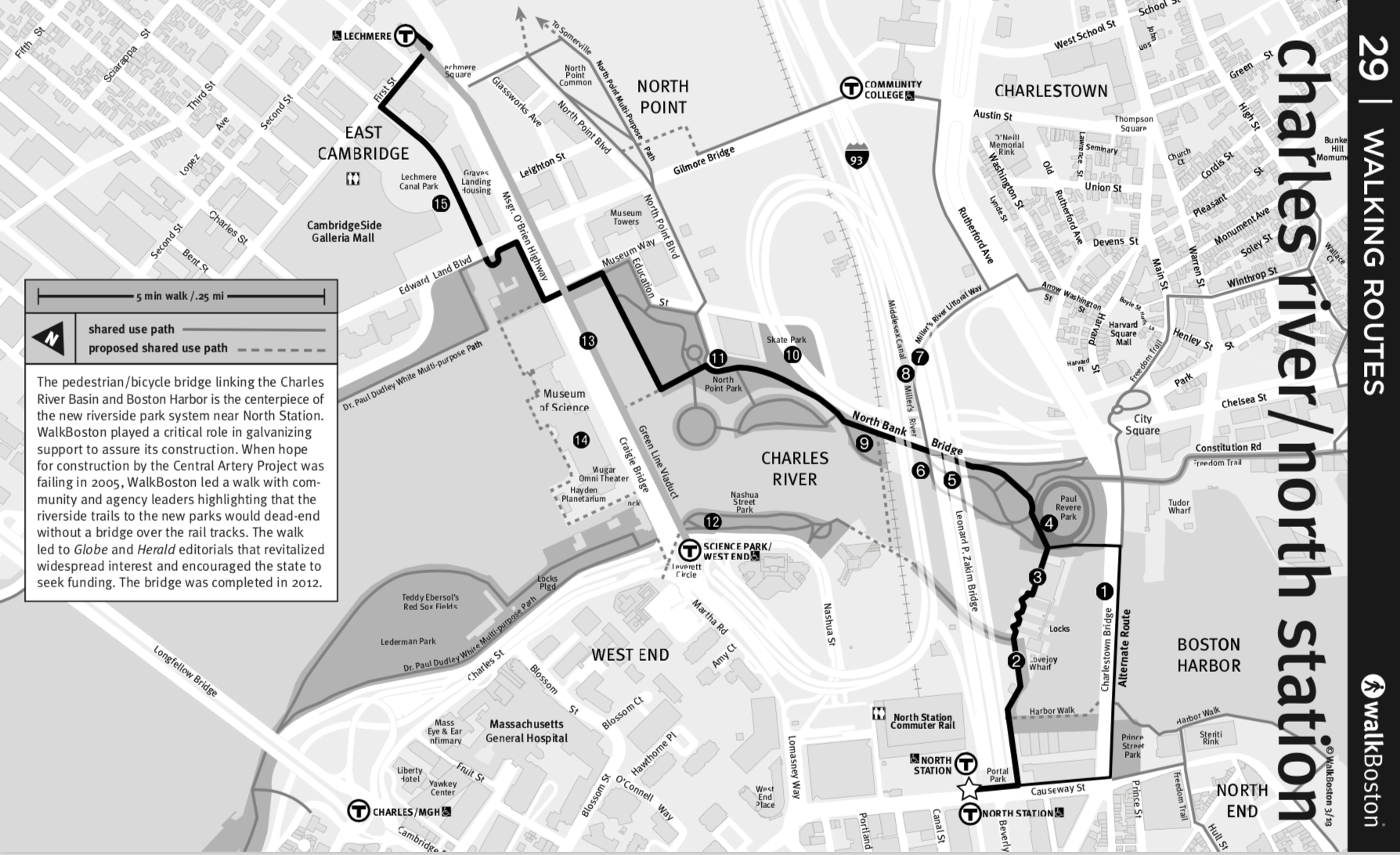 The pedestrian/bicycle bridge linking the Charles River Basin and Boston Harbor is the centerpiece of the new riverside park system near North Station. WalkBoston played a critical role in galvanizing support to assure its construction. When hope for construction by the Central Artery Project was failing in 2005, WalkBoston led a walk with community and agency leaders highlighting that the riverside trails to the new parks would dead-end without a bridge over the rail tracks. The walk led to Globe and Herald editorials that revitalized widespread interest and encouraged the state to seek funding. The bridge was completed in 2012.