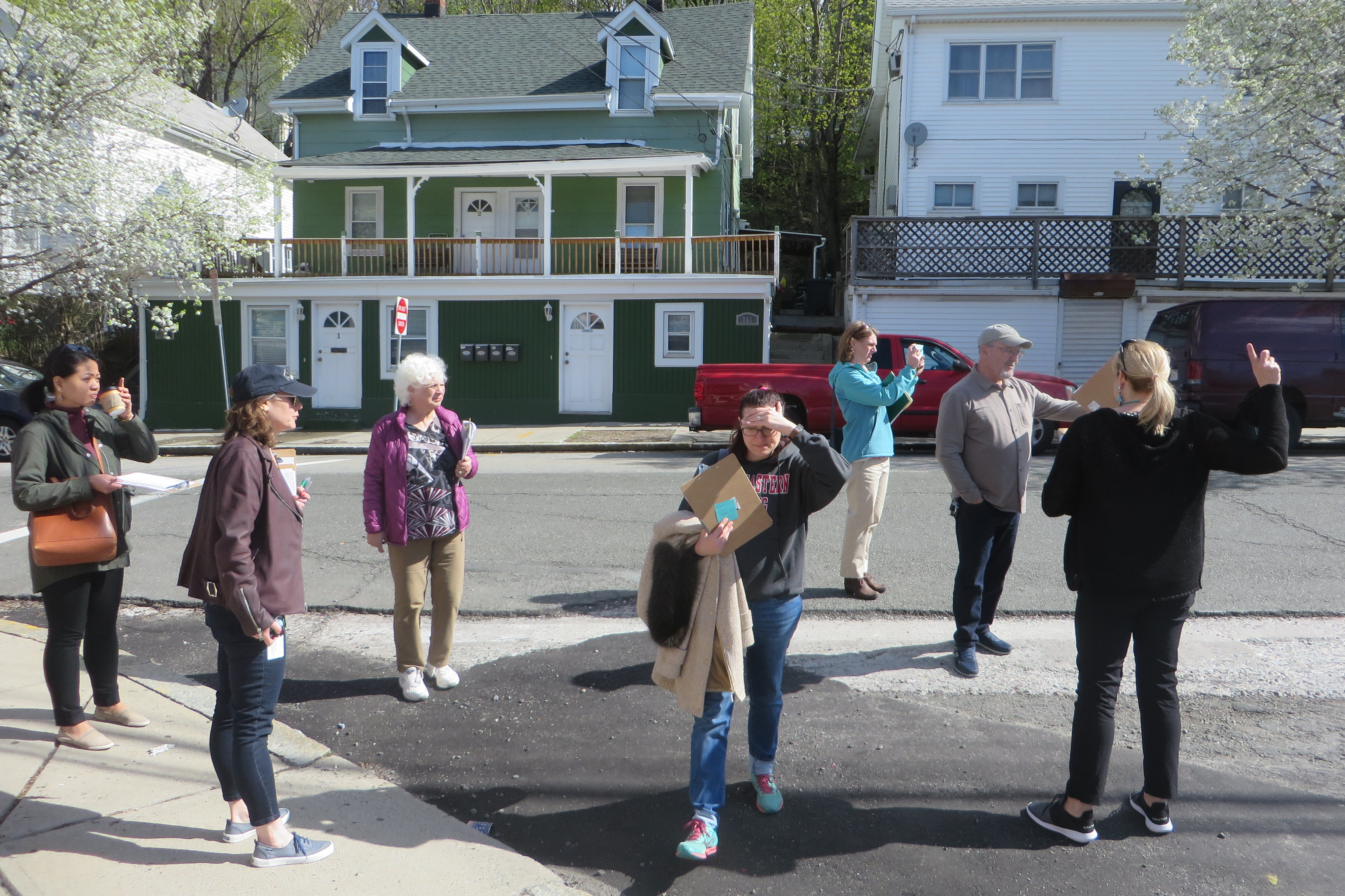 The Beachmont Improvement Commitee, City of Revere staff, and WalkBoston conducted the first of several walk audits in the Beachmont neighborhood. The walk audits are part of the Streets for Healthy and Connected Lives program funded by the Cummings Foundation. Participants walked along Winthrop Avenue and Crescent Avenue looking at ways to make walking safer and easier for residents and children walking home from school through Cummings Square. We picked the best weather day of the week, which is hard to do during this rainy Spring!