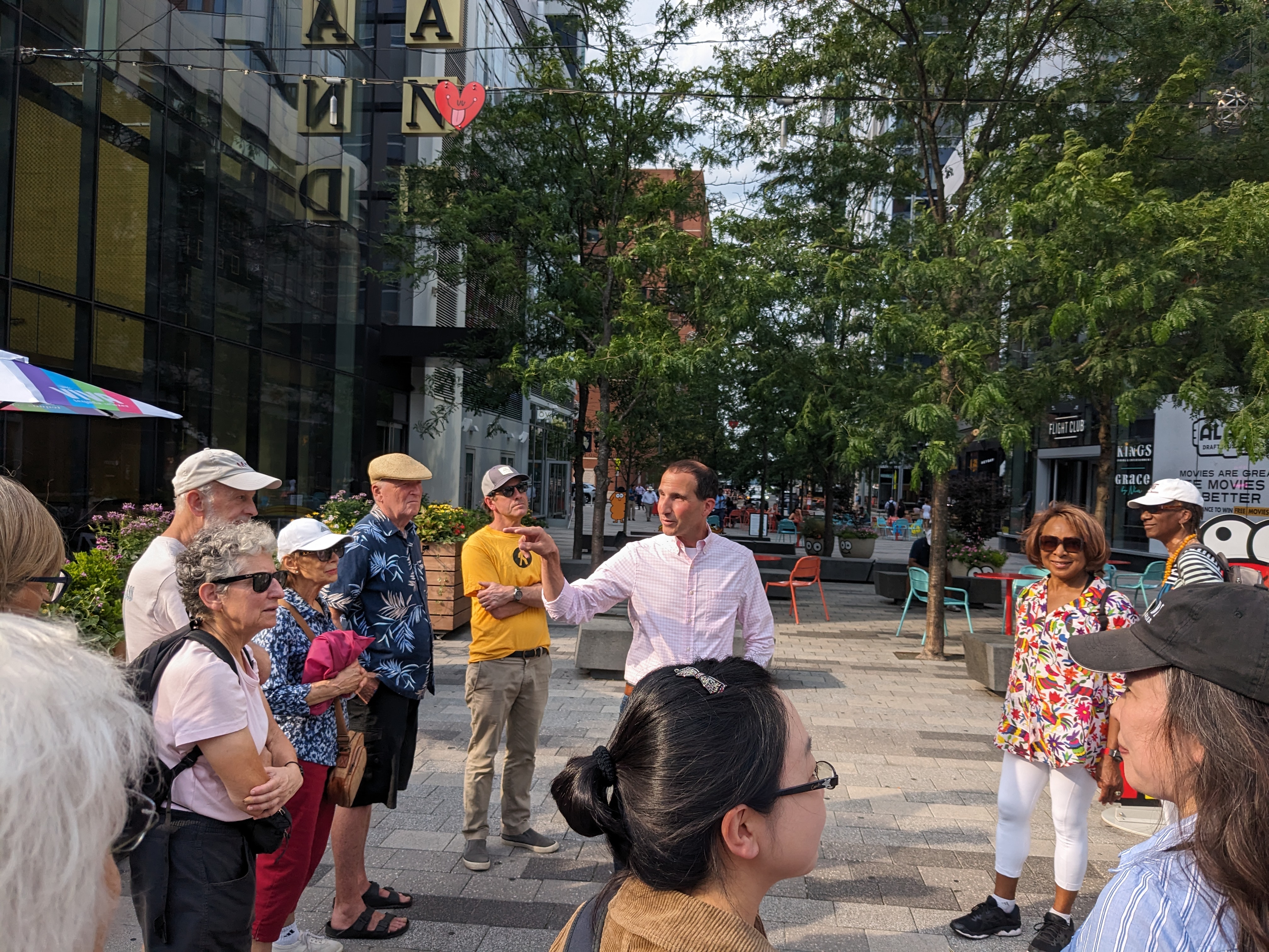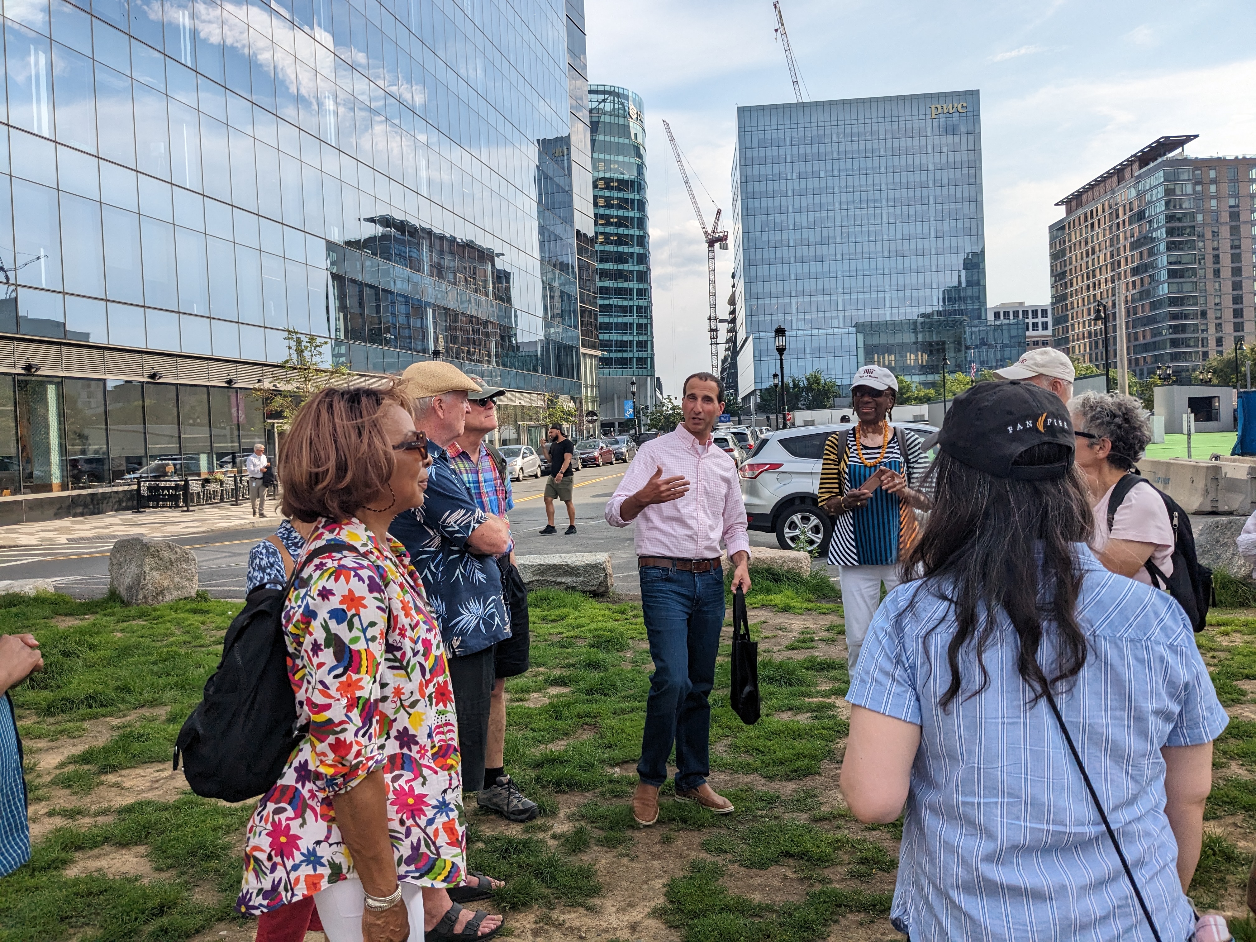 For July, we held a walk called “A Stroll Through the Seaport: Past Present and Future.” Yanni Tsipis, the Senior Vice President of Fenway | Seaport Development at WS Development guided us along a fully accessible walking route in the Seaport District. The route began at Our Lady of Good Voyage Chapel and ended at Cisco Brewers Seaport.