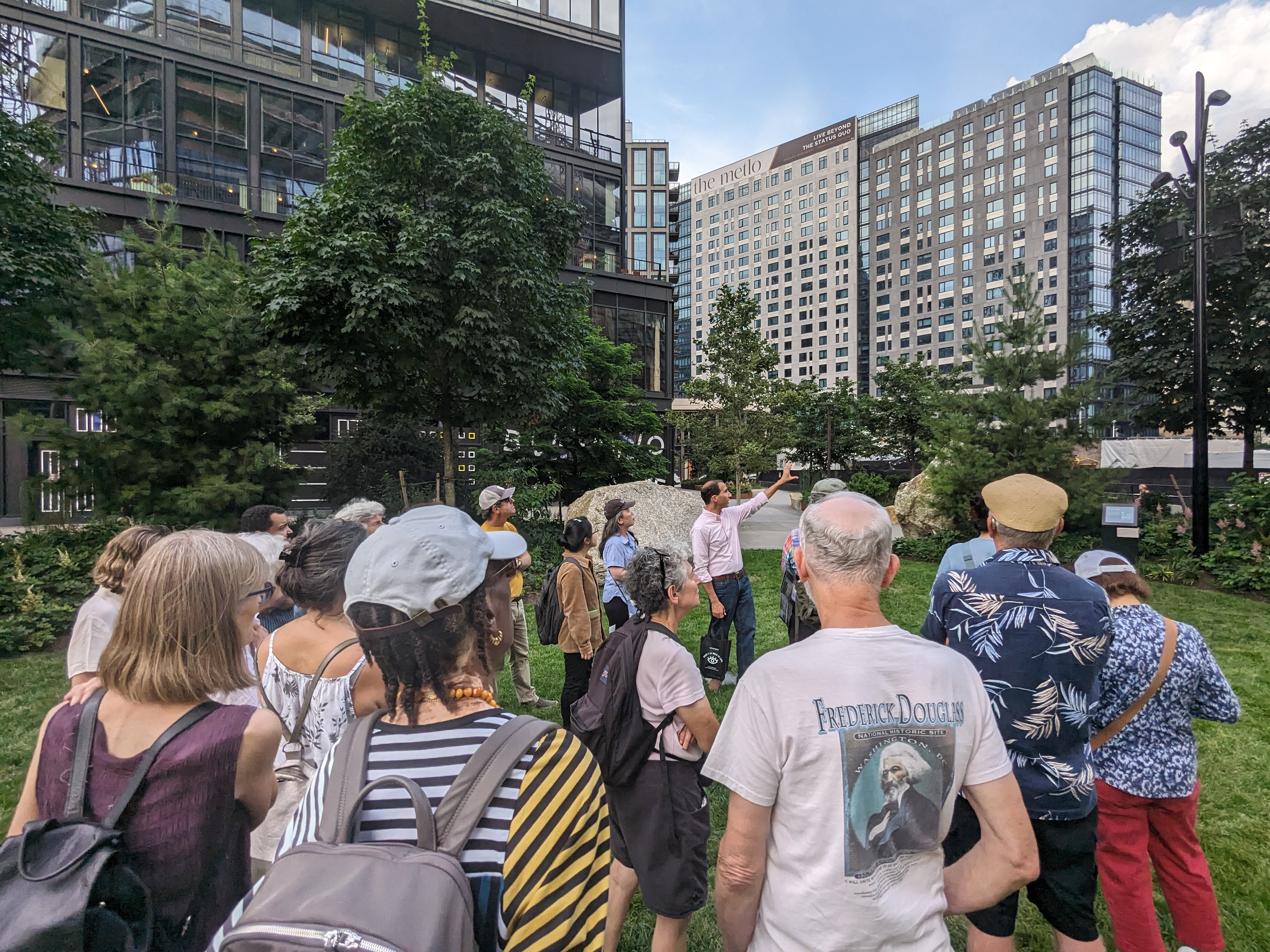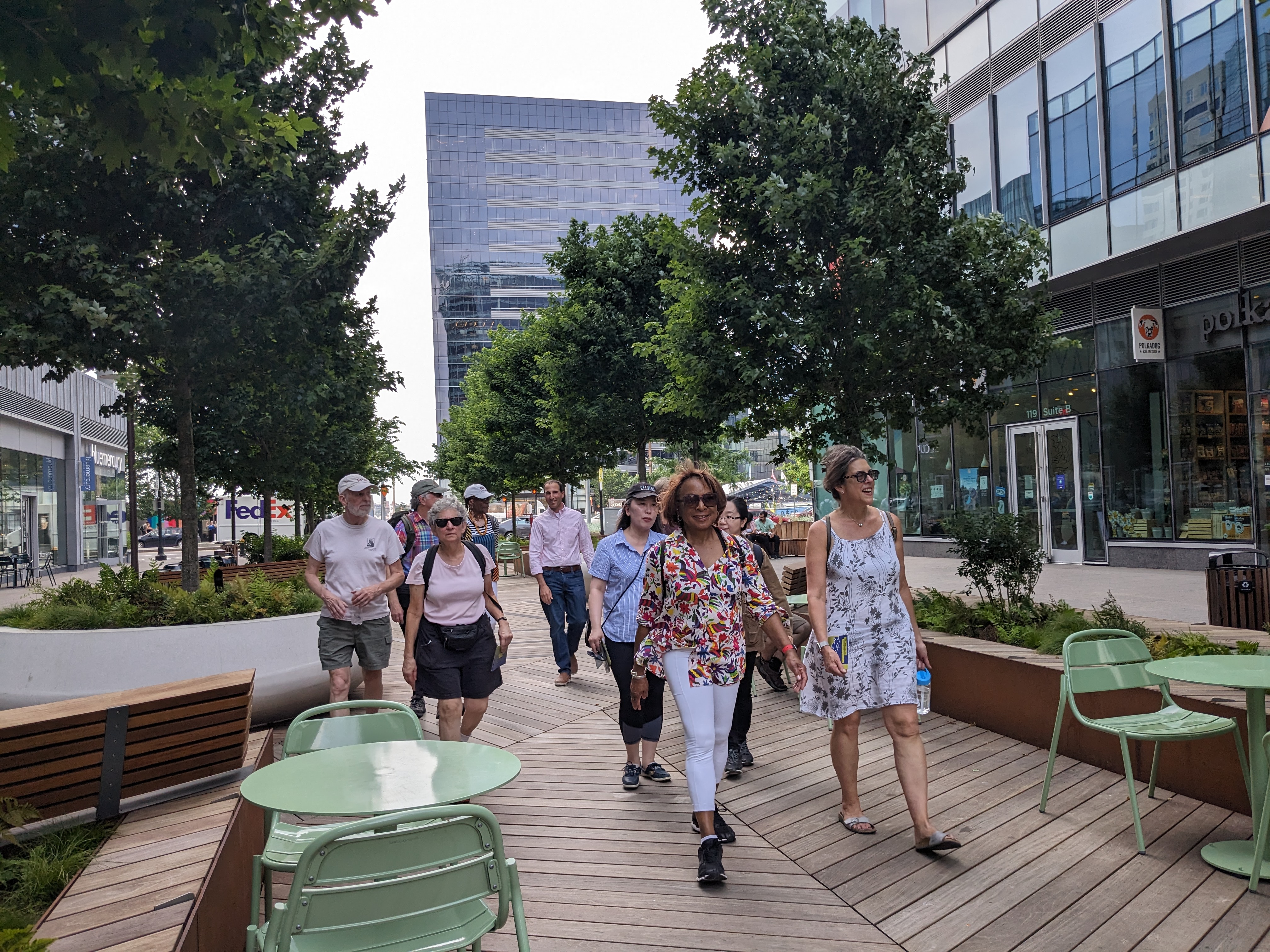 Throughout the walk, Yanni took care to explain the intentionality behind WS’ design choices: planter boxes with native wildflowers that buffer pedestrians from traffic; playful sculptures that create a welcoming energy; the use of wood, grass, and trees to mitigate heat; the gently sloping foundations that will be resilient to sea-level rise.