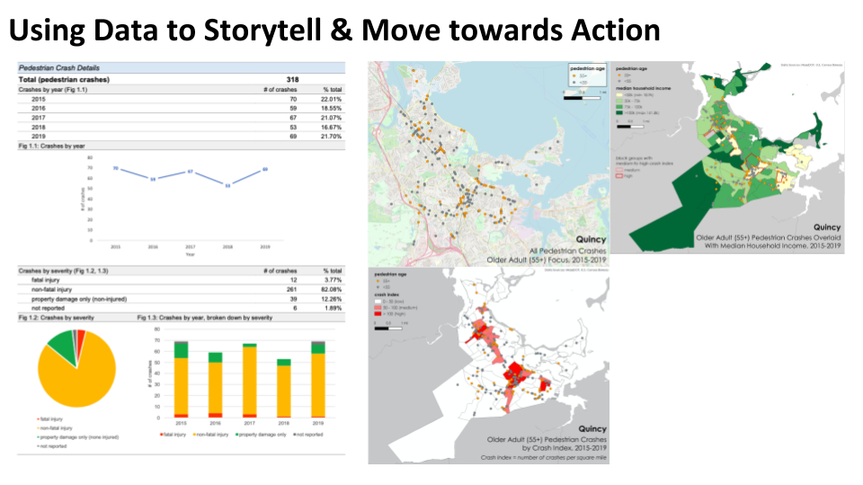 The second project is conducting spatial analysis with an age-friendly focus, shown on the right. We looked at pedestrian crashes involving older adults and how they spatially related to relevant demographic, geographic, and built environment factors. By translating data into compelling visualizations, our analysis can encourage lively community discussions around pedestrian safety and age-friendly walking.