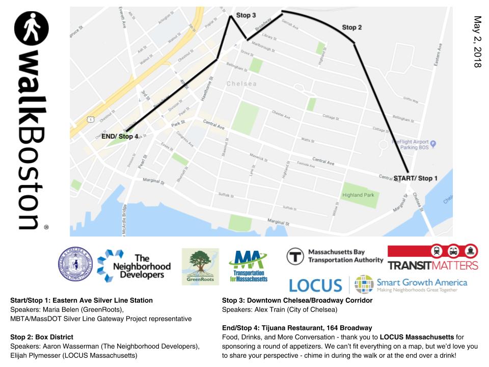 On May 2nd, WalkBoston and community partners hosted a free walk in Chelsea to highlight local walkability, transit and development projects and opportunities, while also emphasizing the need to maintain affordability and prevent displacement. Thanks so much to the 50+ people who attended, especially our speakers and co-hosts: GreenRoots, The Neighborhood Developers, TransitMatters, Transportation for Massachusetts, the City of Chelsea, and LOCUS Massachusetts. See photos on Facebook.