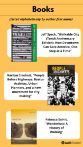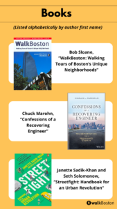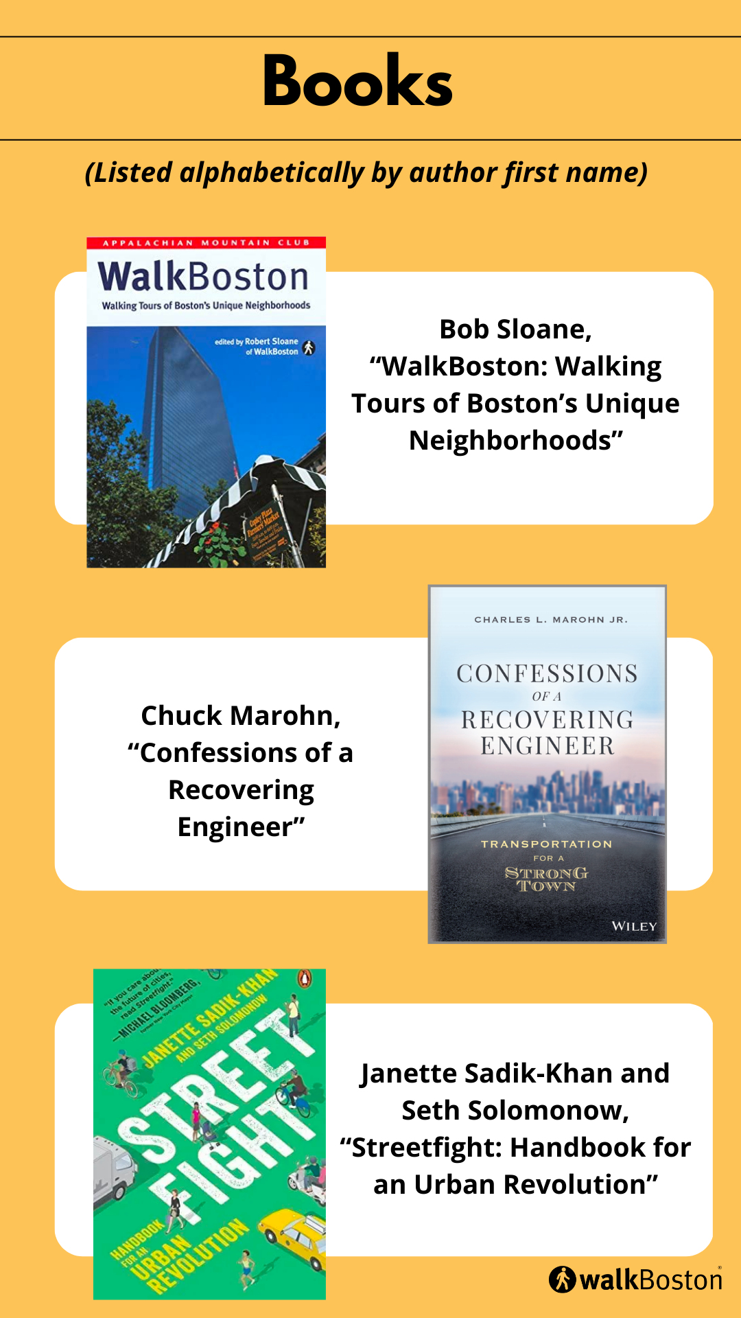 - Bob Sloane, “WalkBoston: Walking Tours of Boston’s Unique Neighborhoods”